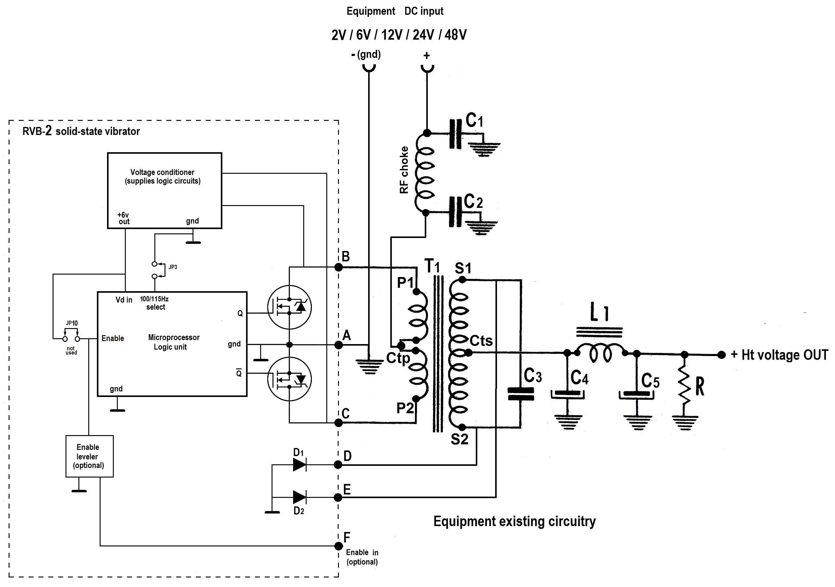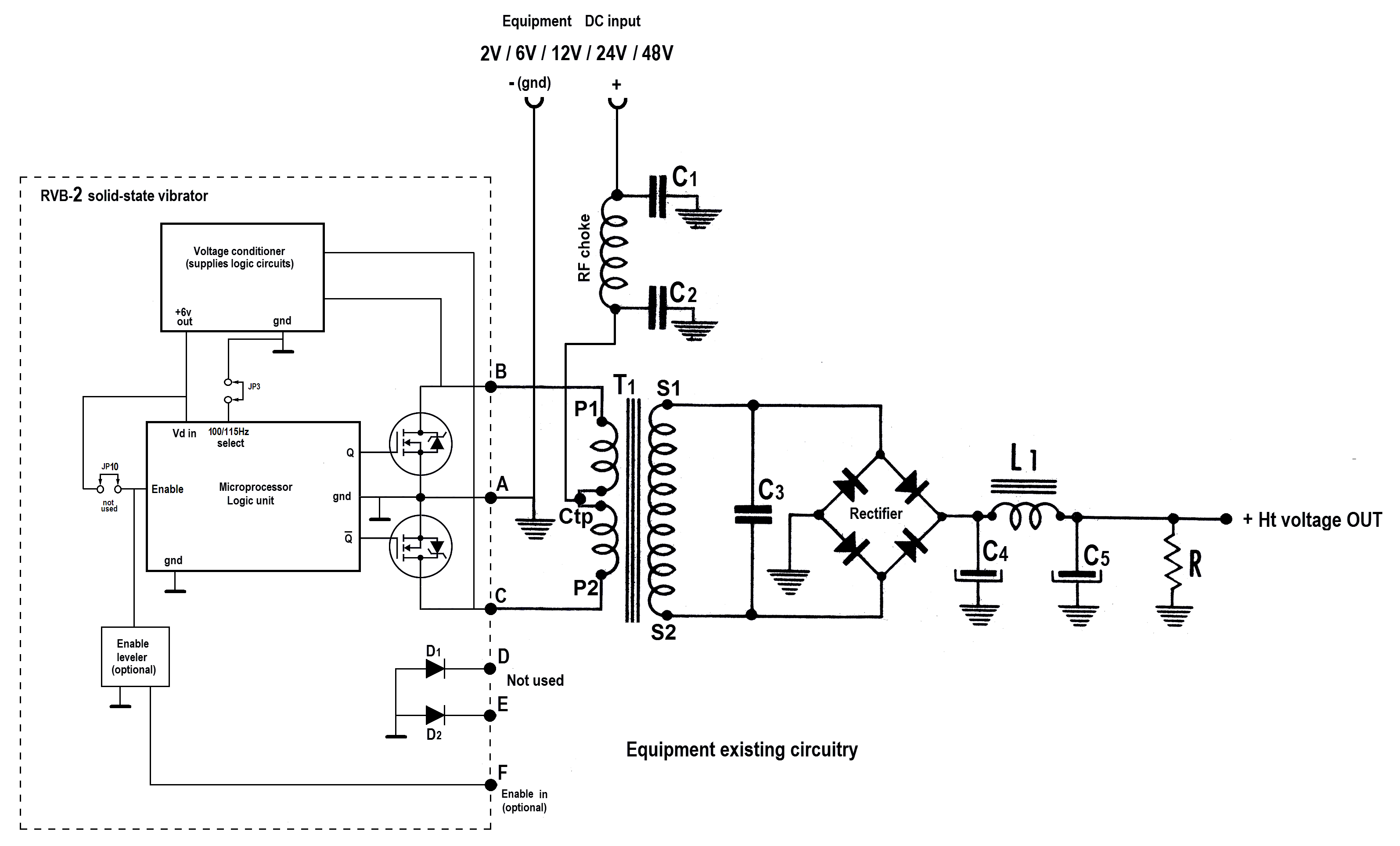 A series type vibrator has the drive coil in series with an extra interrupter contact on the vibrating tongue (the “reed”); this additional contact was specially dedicated for the drive coil. This works identical to the old interrupter-based electric door bells that you might remember from the past. A shunt type vibrator works a bit more complicated. This type has the drive coil connected on one of the primary switch contacts, so one of the primary vibrator contacts has a dual function here. (This is the vibrator type as depicted in fig 1 and 2). As a result, one connector pin could be omitted from the base for such a vibrator, simplifying the vibrator construction itself as well as simplifying the vibrator socket connections during equipment manufacturing. As it turns out, the parallel (shunt) type vibrator is the most sensitive to the phenomenon of corroded contacts. When this happens with a shunt-type vibrator, the vibrator simply won’t start up any more. A series type vibrator is less sensitive to the phenomenon of contact corrosion; such a vibrator will mostly still vibrate even when no HT is being generated any more due to additional corroded contacts (be it the primary or secondary vibrator contacts) When replacing a series type vibrator with the RVB-2, things are simple: Just forget about the vibrator’s series terminal. No connection to the RVB-2 needs to be made here. The reason is that the RVB-2 derives its internal supply voltage from the equipment primary circuit, so it will work regardless if a series or shunt type vibrator is being replaced. However, there is one exception. Certain military transceiver equipment might use the series contact of a (series) vibrator to start or stop the power supply. This is done in certain situations where additional transmitter circuits get powered-up when switching the equipment in the transmit mode. In order to save an additional power relay, this sometimes is accomplished by keeping the vibrator series coil powerless during the receive cycle and subsequently powering it when transmitting (Obviously the equipment is then equipped with TWO vibrator power supplies, one for the receiver, and one for the additional transmitter circuits). If you want to emulate such a series-type vibrator, you need to order the RVB-2 version with the enable circuit installed (see RVB-2 block diagram in fig 3). The vibrator terminal for its series coil is then connected to RVB-2 terminal F. When the vibrator contact is powerless (zero volts coming from the equipment) the RVB-2 is in tri-state (high impedance) mode at the MOSFET outputs, resulting in the power supply as a whole being turned off. When the series coil voltage becomes active (powered anywhere from 5V to 30V) the RVB-2 will start running. In this way the RVB-2 can be used to turn the equipment’s power supply ON or OFF, depending on the voltage of the RVB-2 enable input. Just as this was the case with the original series vibrator. It needs to be mentioned that this start-stop scenario is a very rare configuration though. It obviously does not apply to equipment where the power supply always runs such as car radios and most military equipment. It is therefore unlikely you will ever have to deal with this scenario when replacing a vibrator with the RVB-2 board. However we wanted to mention it here, to be complete. Multi-compatible equipment Lots of vintage military equipment is laid-out such that both series style as well as shunt-style vibrators can be used, to simplify logistical processes involving spare parts. In this case, things are simple – don’t connect anything to the vibrator coil terminal(s). The RVB-2 will work perfectly in either case. |